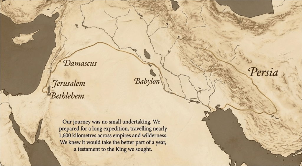 The journey from our land to Judea was long—more than 1,600 kilometres. It took around 10-12 months. We travelled in caravans with camels and servants, moving perhaps twenty or thirty kilometres a day. The journey was tough. The weather was harsh. Some days the sun burned our skin; some nights the cold bit our bones. The terrain was difficult. Bandits watched the roads. We carried valuables and gifts; we were tempting targets.